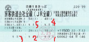 きっぷの写真に赤字で1~5までの番号をつけてみました。