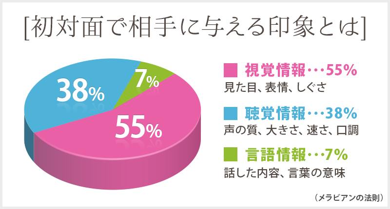 初対面で人と人があった時に、相手が注目しているのは、話す内容7%、それ以外の93%(視覚情報55%、聴覚38%)は話す内容以外 という法則です。