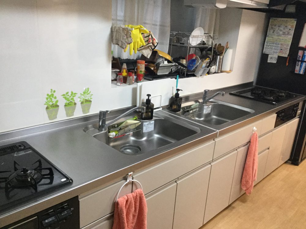 台所はこんな感じ。3口コンロが二つ、流しもそれぞれ二つ。冷蔵庫も大きいのが二台!