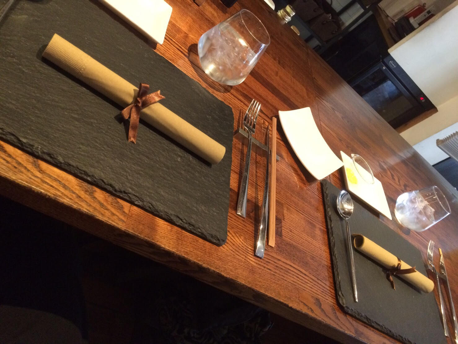 席についてあった時に、瓦の素材でできた黒のプレートが敷かれてありました。