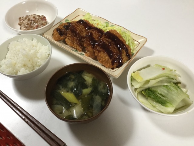 文の里商店街で購入した”切り口に大量の塩を埋め込んでやった”で登場の白菜の漬物と、半目の写真を撮ってしまい少し申し訳なさを感じた、大阪屋の豚カツでディナーだ!!!!