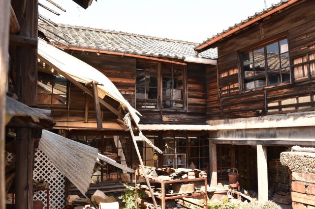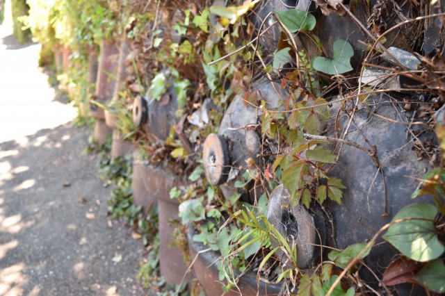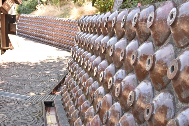 昔は、上手く焼けなかった常滑焼きの土管や焼酎瓶などを、こうやって家の補強に使っていたんだって。